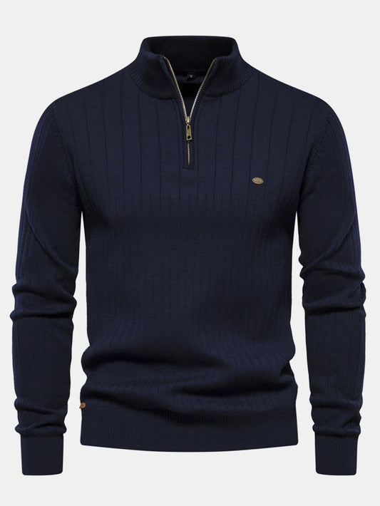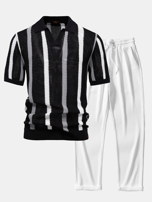 Stripe Knit V Neck Polo Shirt & Straight Leg Ribbed Pants