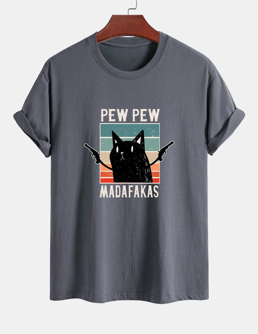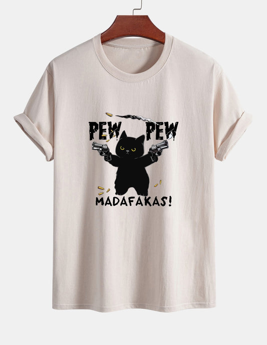 Regular Fit PEW PEW MADAFAKAS Black Cat Print Cotton T-Shirt