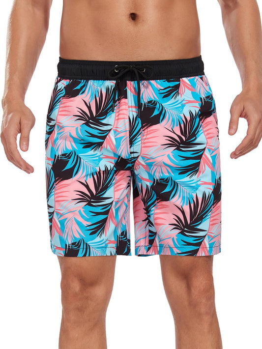 2 In 1 Tropical Leaves Print Pocket Drawstring Swim Shorts