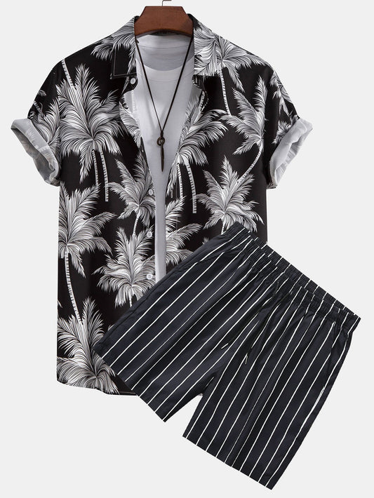 Palm Trees Print Button Up Shirt & Striped Swim Shorts