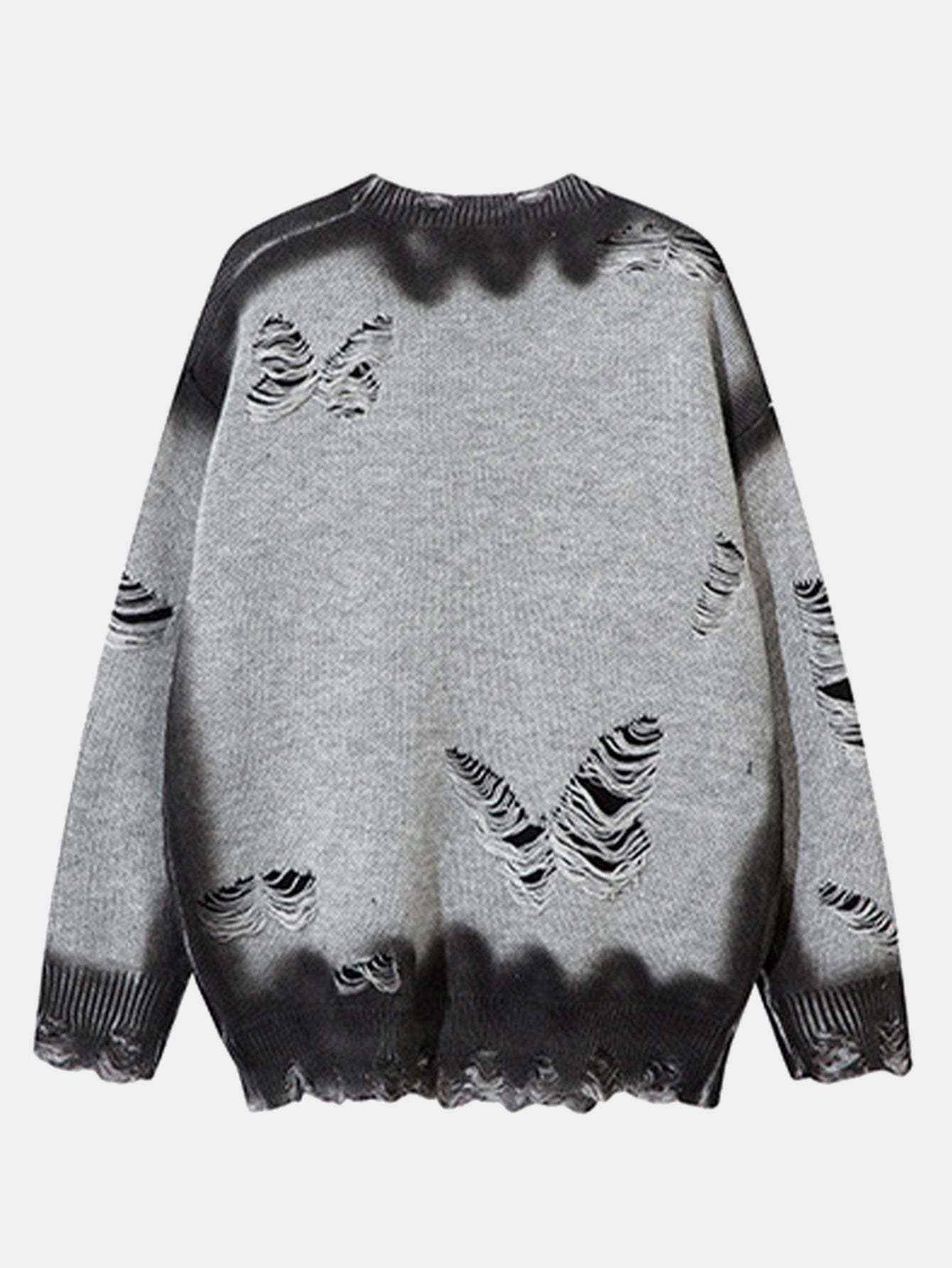 Crafted from soft knit fabric, it features bold butterfly graphics and edgy distressed details that give it a worn-in, grunge-inspired vibe. With a relaxed fit and ribbed edges, this sweater combines comfort with standout design, perfect for layering or making a statement on its own.