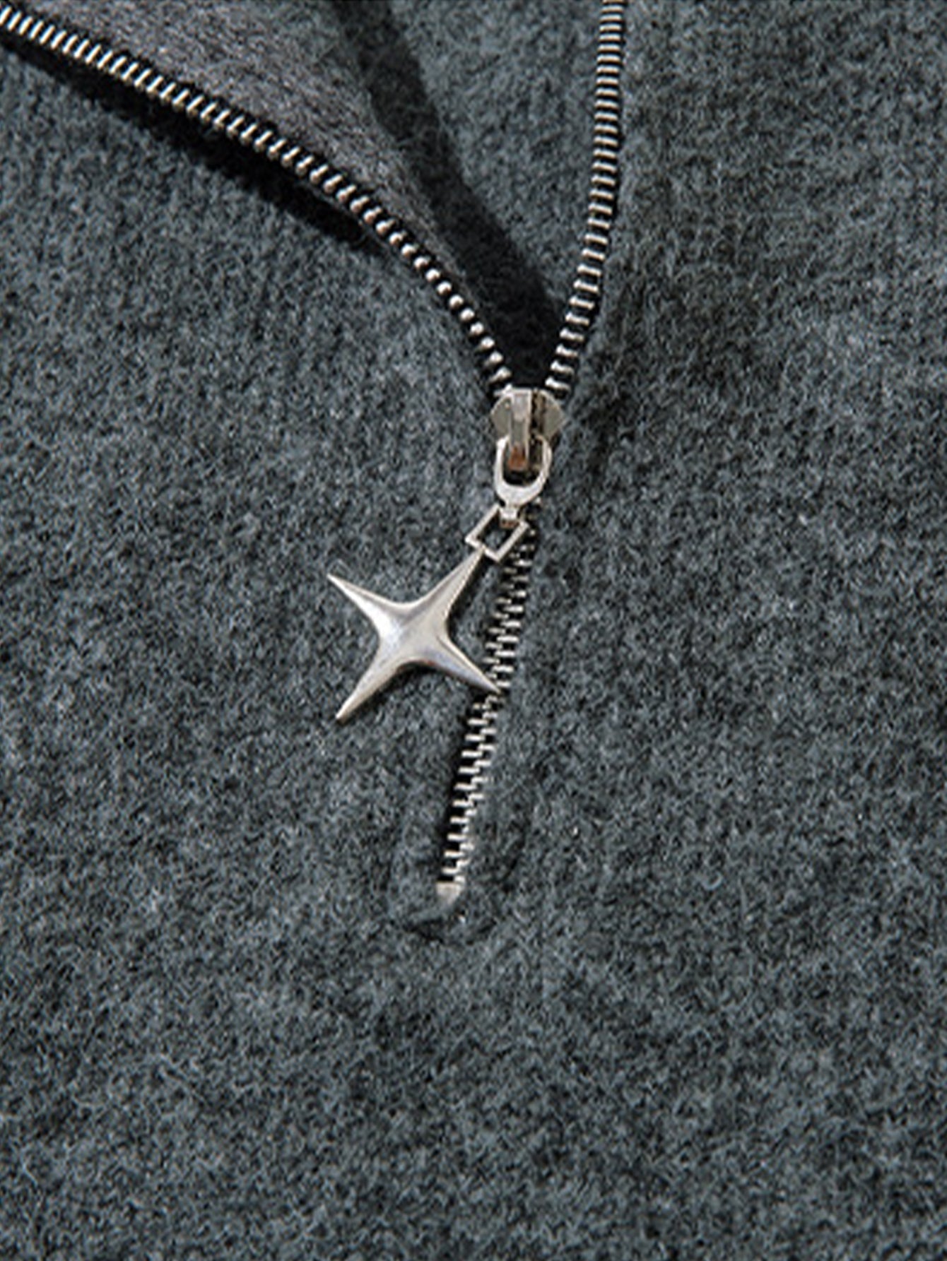 Crafted from soft knit fabric, it delivers warmth and comfort while standing out with its raw distressed edges along the hem, cuffs, and neckline. The half-zip front with a unique puller detail adds both function and style, making it easy to layer or wear on its own. Perfect for creating a streetwear-inspired, laid-back look with attitude.