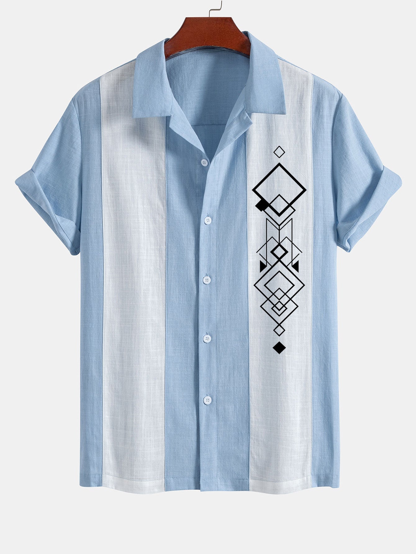 Geometric Rhombus Print Linen Look Patchwork Bowling Shirt